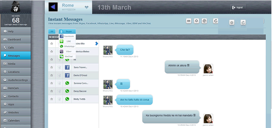 All conversations or chat with WhatsApp, Skype, iMessage, Viber, WeChat or BBM are recorded and readable at all times.